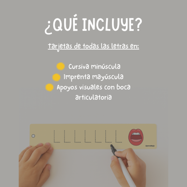 Este llavero incluye tarjetas con todas las letras del abecedario, en cursiva minúscula e imprenta mayúscula, acompañadas de apoyos visuales que facilitan la articulación y la práctica.